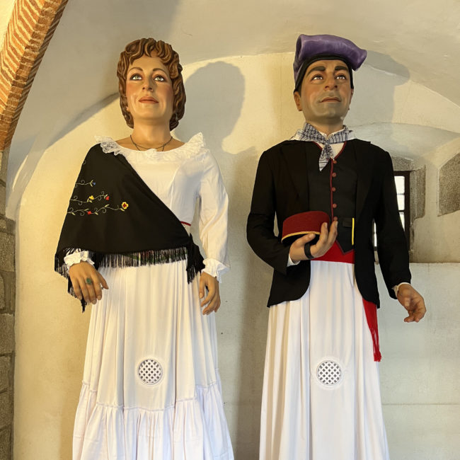 Vestuari de dos gegantons de l’Escola Damià Mateu de Llinars del Vallès que representen una parella del Ball de Gitanes de la Colla Giola . Els gegantons han estat construïts pel taller Imatgeria Festiva Guardi.
